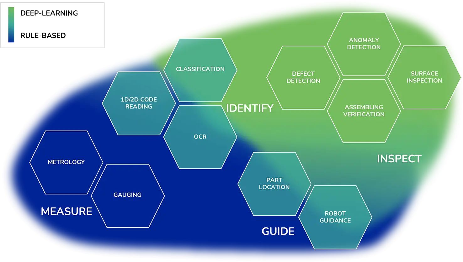 Below is a visual comparison highlighting the strengths of deep learning vs. rule-based machine vision across typical industrial tasks — such as defect detection, code reading, measurement, and robotic guidance.