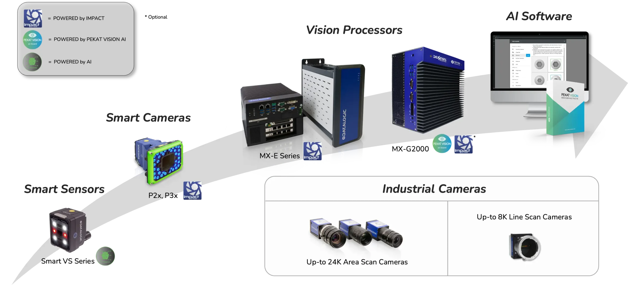 Explore our complete range of machine vision products developed by the Datalogic Group, covering both deep learning and traditional rule-based technologies. From compact smart sensors to high-performance vision processors and advanced inspection software, our portfolio enables reliable visual inspection, measurement, guidance, and identification across a wide range of industries and applications.