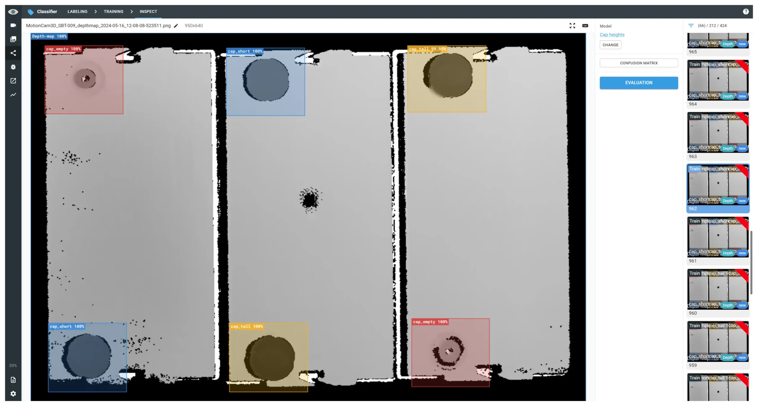 With a standard 2D camera, the height difference between the caps could be difficult to spot. Instead, we used a 3D scanner to capture the complete surface profile and convert the data into depth maps, where height variations appear clearly: